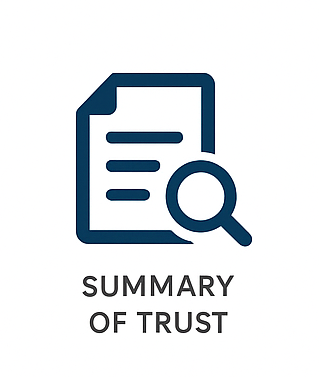 The Summary of Trust provides a concise overview of the key details of your trust — including trustees, beneficiaries, and essential powers — without revealing the full trust document. It’s your quick reference guide for financial institutions and advisors.